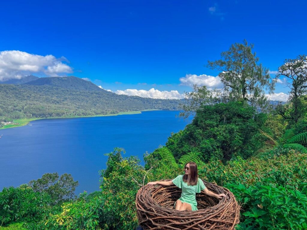 Wanagiri Hidden Hills is a photographer’s paradise, offering a variety of photo spots including swings, bamboo structures, and hanging nests with stunning views of Lake Buyan and surrounding lush mountains. Professional photo assistants are available to help visitors achieve optimal shots with reflectors, and rental dresses are offered on-site for those wishing to enhance their photo aesthetic.
