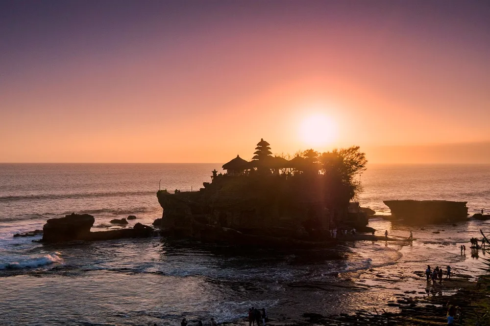 Tanah Lot Temple, perched on a rock formation surrounded by waves, is a breathtaking sight, especially during sunset. The changing colours of the sky provide a stunning backdrop, making it a favourite subject for photographers. The golden hour lighting enhances the temple’s unique Balinese architecture and cultural significance.